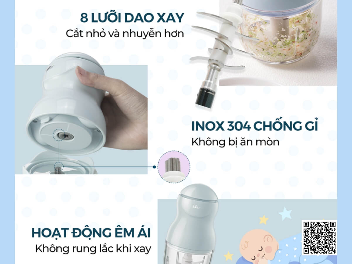 Máy xay ăn dặm Bear GR-B03V8 được trang bị 8 lưỡi dao inox 304 thiết kế hình chữ S siêu sắc, giúp xay nhuyễn thực phẩm đồng đều chỉ trong vài giây. Lưỡi dao inox không gỉ, an toàn tuyệt đối cho sức khỏe bé, đồng thời duy trì độ bền và sắc bén trong thời gian dài. So với các dòng máy 3 lưỡi thông thường, Bear GR-B03V8 mang lại hiệu quả xay mịn và nhanh hơn gấp đôi – rất lý tưởng cho các loại cháo, súp, trái cây hoặc thực phẩm ăn dặm cần độ mịn cao.