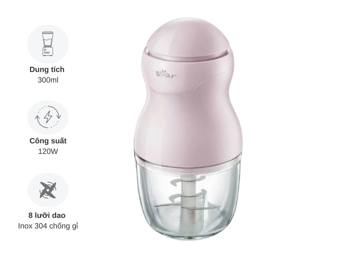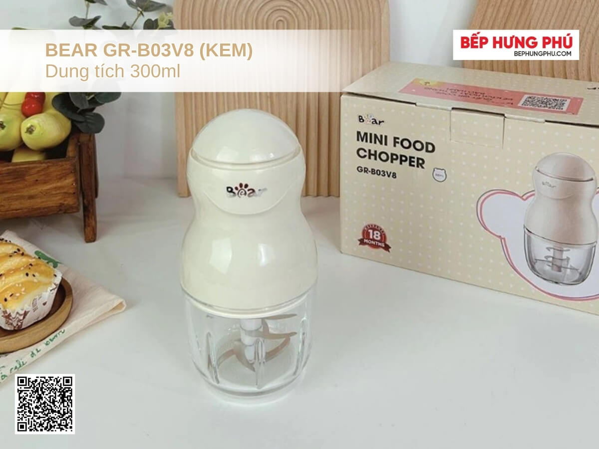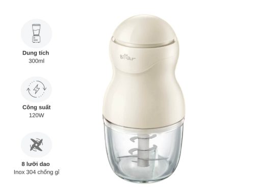 Máy xay ăn dặm Bear GR-B03V8 với thiết kế màu kem, nhỏ gọn. Dung tích 300 ml, trang bị 8 lưỡi dao inox 304, công suất 120W, cối thủy tinh Borosilicate chịu nhiệt cao và thiết kế tháo rời dễ vệ sinh, trợ thủ đắc lực để mẹ chuẩn bị những bữa ăn dặm nhuyễn mịn, an toàn cho bé yêu.