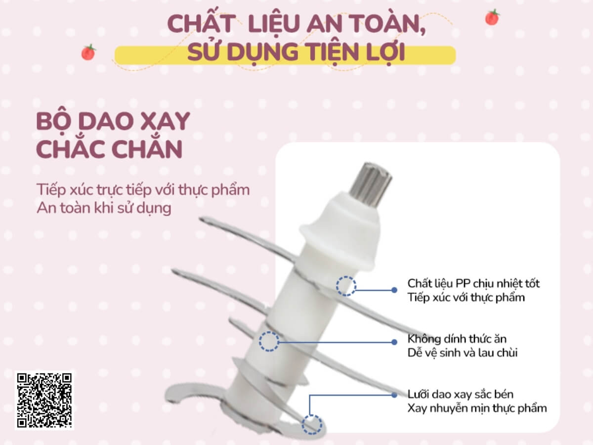 Máy xay ăn dặm Bear GR-B03V8 được trang bị 8 lưỡi dao inox 304 thiết kế hình chữ S siêu sắc, giúp xay nhuyễn thực phẩm đồng đều chỉ trong vài giây. Lưỡi dao inox không gỉ, an toàn tuyệt đối cho sức khỏe bé, đồng thời duy trì độ bền và sắc bén trong thời gian dài. So với các dòng máy 3 lưỡi thông thường, Bear GR-B03V8 mang lại hiệu quả xay mịn và nhanh hơn gấp đôi – rất lý tưởng cho các loại cháo, súp, trái cây hoặc thực phẩm ăn dặm cần độ mịn cao.