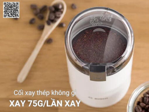 Máy xay cà phê Bosch TSM6A011W trang bị cối xay bằng thép không gỉ cao cấp, bền chắc và đảm bảo không ảnh hưởng đến hương vị cà phê khi xay. Có thể xay được 75g hạt cà phê rang trong mỗi lần xay, đủ dùng để pha cà phê đen hoặc espresso cho nhu cầu cá nhân.
