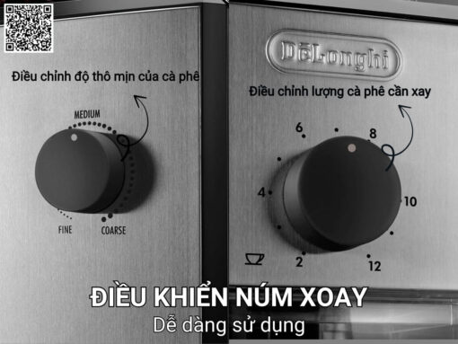 Máy xay cà phê DeLonghi KG89 thiết kế 2 núm xoay đơn giản, dễ dàng điều khiển máy, phù hợp với mọi người dùng. 1 núm xoay ở mặt trước máy để điều chỉnh lượng cà phê cần xay và 1 núm xoay ở bên hông máy để điều chỉnh độ thô mịn của cà phê.