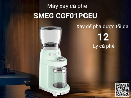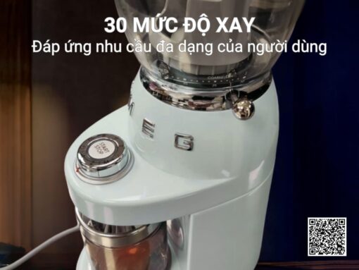 Máy xay cà phê Smeg CGF01PGEU sở hữu thiết kế sang trọng, kích thước nhỏ gọn, dễ dàng phù hợp với nhiều không gian từ gia đình đến văn phòng, khách sạn, quán cà phê sang trọng… Công suất 150W cùng thiết kế bộ phận xay hình nón chuyên nghiệp giúp xay cà phê thơm ngon hoàn hảo. Có thể tuỳ chọn 30 mức độ mịn của cà phê để phù hợp pha nhiều loại cà phê khác nhau như espresso, cà phê kiểu Pháp, cà phê phin… Hộp chứa hạt cà phê dung tích 350g, hộp chứa bột cà phê dung tích 130g, có thể xay để pha được tối đa 12 tách cà phê. Hệ thống điều khiển gồm núm xoay và thanh gạt dễ dàng sử dụng.