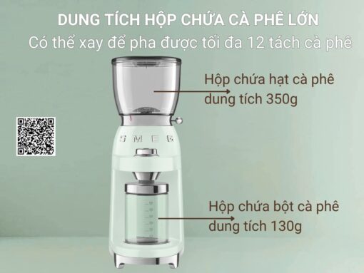 Máy xay cà phê Smeg CGF01PGEU trang bị hộp chứa hạt cà phê dung tích 350g và hộp chứa bột cà phê dung tích 130g. Với dung tích này, bạn có thể xay để pha được tối đa 12 tách cà phê với mỗi lần xay.