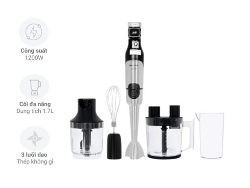 Máy xay cầm tay Philips HR2685/00 bao gồm 1 chân trộn với lưỡi dao 2 cánh, có thể xay sinh tố trực tiếp trong cốc đựng đi kèm, hoặc xay cháo nóng trong nồi tiện lợi. Và 1 cối xay đa năng cùng lưỡi dao 2 cánh, có thể xay đa năng nhiều nguyên liệu như xay sinh tố, xay rau củ, gia vị, đặc biệt có 3 đĩa cắt tròn thuận tiện cắt thái, bào sợi rau củ… Ngoài ra còn có cối xay thịt để xay thịt, cá và cây đánh trứng giúp bạn dễ dàng đánh trứng, đánh kem để làm bánh… Công suất 1200W mạnh mẽ cùng các lưỡi dao sắc bén, giúp xay nhanh và khoẻ, dễ dàng điều chỉnh với nhiều tốc độ xay phù hợp với nhu cầu.