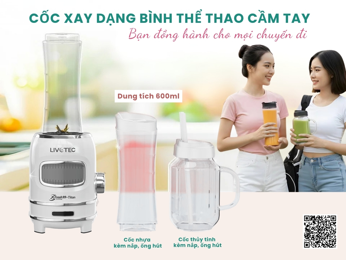 Máy xay sinh tố Livotec LVB-522W đi kèm hai cối xay dạng bình thể thao, thiết kế nhỏ gọn, nắp đậy kín và có quai xách tiện dụng. Sau khi xay xong, người dùng có thể mang theo trực tiếp mà không cần rót sang bình khác, rất thích hợp cho dân văn phòng, sinh viên hoặc người tập gym. Chất liệu cối bền chắc, an toàn, chịu được va đập nhẹ, giúp bảo quản tốt thức uống mà không lo tràn đổ. Thiết kế này mang đến sự linh hoạt và tiện lợi tối đa, đồng hành cùng bạn mọi lúc, mọi nơi.