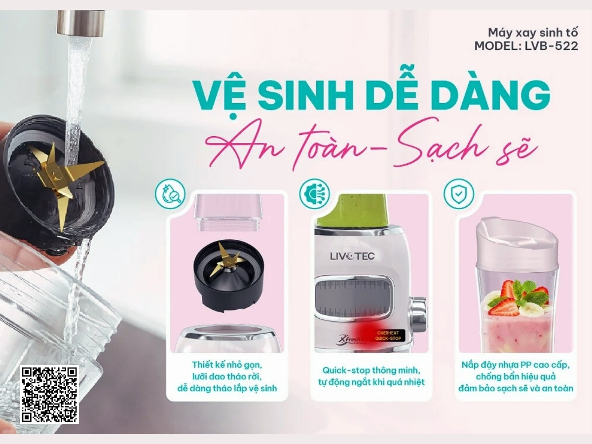 Một ưu điểm không thể bỏ qua của máy xay sinh tố Livotec LVB-522W là khả năng tháo rời dễ dàng giữa các bộ phận: cối xay, nắp, và lưỡi dao. Thiết kế thông minh này giúp việc vệ sinh trở nên đơn giản và nhanh chóng, hạn chế bám cặn thực phẩm. Người dùng chỉ cần rửa sạch dưới vòi nước là có thể tiếp tục sử dụng ngay cho lần sau. Nhờ cấu trúc chắc chắn và chất liệu bền, máy luôn duy trì được độ sáng đẹp, sạch sẽ và an toàn trong suốt thời gian sử dụng.