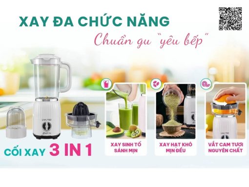 Máy xay sinh tố Livotec LVB-622W là dòng máy xay đa năng thế hệ mới, tích hợp 3 chức năng xay ướt, xay khô và vắt cam trong cùng một thiết bị nhỏ gọn. Với công nghệ xay FRESH99+Titan, máy giúp xay sánh mịn nguyên chất, giữ trọn hương vị tươi ngon của thực phẩm. Cấu tạo tinh tế, vận hành êm ái cùng độ bền cao, LVB-622W là lựa chọn lý tưởng cho gian bếp hiện đại.