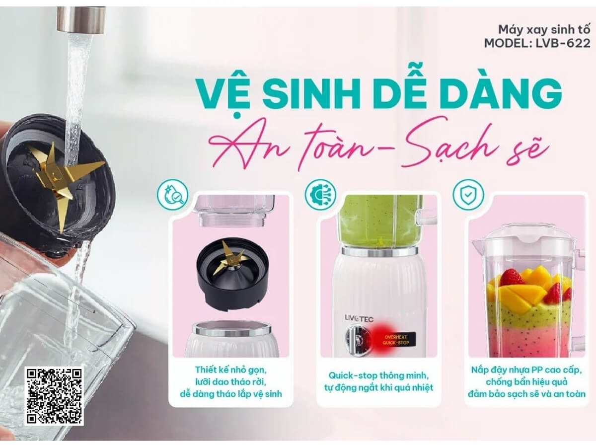 Máy xay sinh tố Livotec LVB-622W được thiết kế với cấu trúc tháo lắp linh hoạt, giúp người dùng dễ dàng tách rời từng bộ phận sau mỗi lần sử dụng. Việc vệ sinh trở nên nhẹ nhàng và nhanh chóng hơn, đảm bảo cối xay và lưỡi dao luôn sạch sẽ, không bám cặn thực phẩm. Thiết kế này không chỉ giúp duy trì hiệu suất xay ổn định, mà còn kéo dài tuổi thọ của máy và giữ an toàn vệ sinh cho người dùng trong quá trình chế biến.