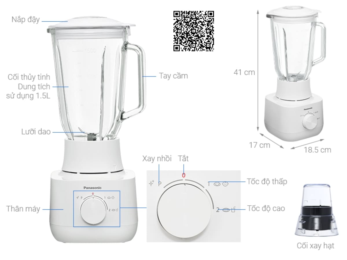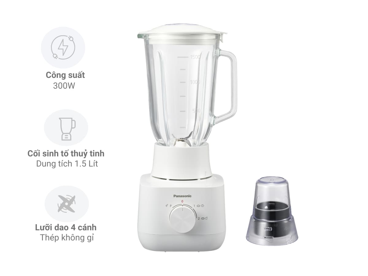Máy xay sinh tố Panasonic MX-EG5311WRA trang bị 2 cối xay: cối xay sinh tố bằng thủy tinh 1.5 lít và cối xay khô bằng nhựa 50g, có thể xay sinh tố, xay hạt, gia vị… đáp ứng nhu cầu đa dạng của gia đình. Công suất 300W kết hợp với 2 lưỡi dao 4 cánh và 2 cánh riêng biệt bằng thép không gỉ sắc bén giúp xay nhanh và khoẻ các nguyên liệu. Có 2 tốc độ xay và 1 chế độ nhồi, dễ dàng điều chỉnh bằng nút vặn, phù hợp với mọi người dùng.
