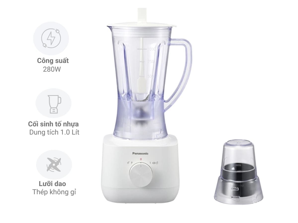 Máy xay sinh tố Panasonic MX-EP3111WRA trang bị 2 cối xay: cối xay sinh tố 1 lít và cối xay khô 50g, có thể xay sinh tố, xay hạt, gia vị… đáp ứng nhu cầu đa dạng của gia đình. Công suất 280W kết hợp với 2 lưỡi dao 4 cánh và 2 cánh riêng biệt bằng thép không gỉ sắc bén giúp xay nhanh và khoẻ các nguyên liệu. Có 1 tốc độ xay và 1 chế độ nhồi, dễ dàng điều chỉnh bằng nút vặn, phù hợp với mọi người dùng.