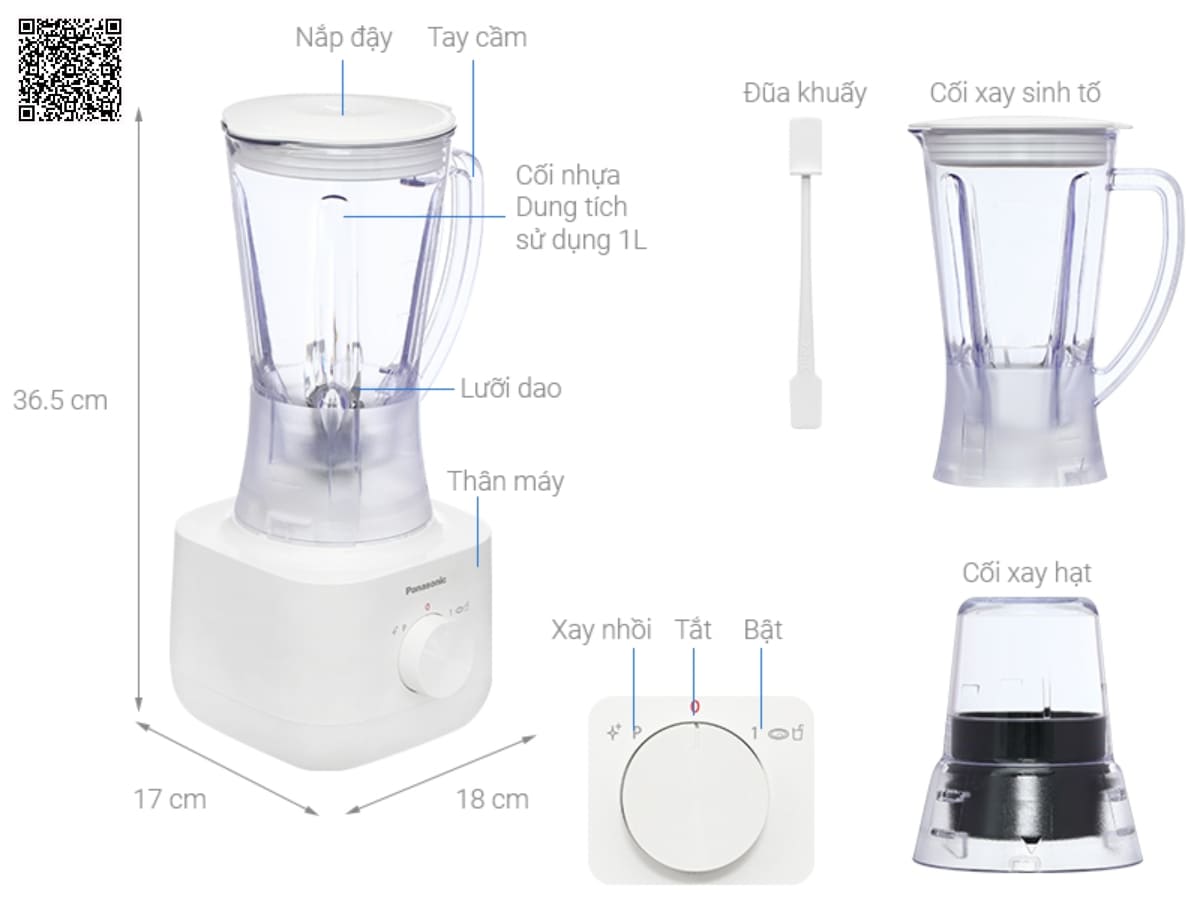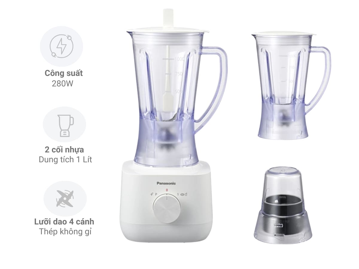 Máy xay sinh tố Panasonic MX-EP3171WRA trang bị 3 cối xay gồm: 2 cối xay sinh tố 1 lít và 1 cối xay khô 50g, có thể xay sinh tố, xay hạt, gia vị… đáp ứng nhu cầu đa dạng của gia đình. Công suất 280W kết hợp với lưỡi dao 4 cánh và 2 cánh riêng biệt bằng thép không gỉ sắc bén giúp xay nhanh và khoẻ các nguyên liệu. Có 1 tốc độ xay và 1 chế độ nhồi, dễ dàng điều chỉnh bằng nút vặn, phù hợp với mọi người dùng.