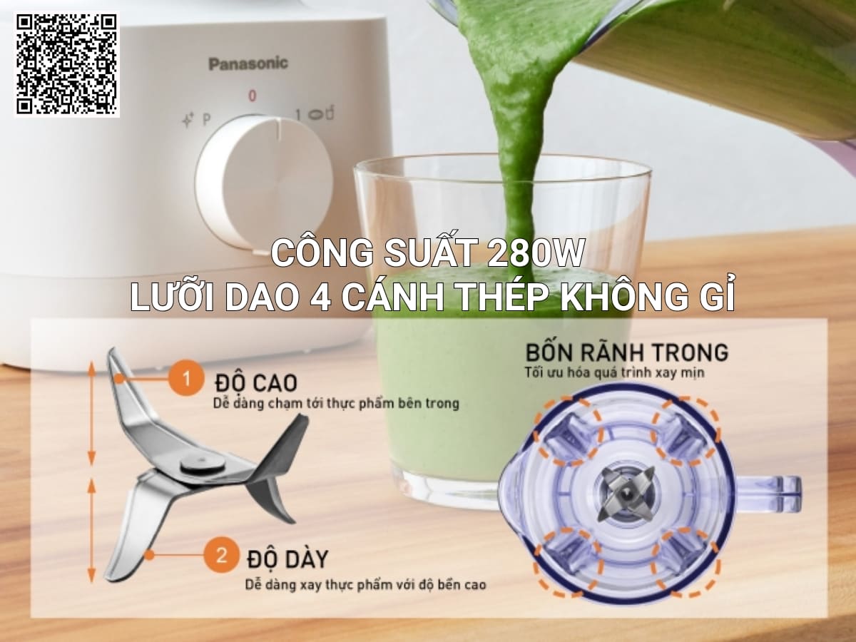 Công suất 280W, lưỡi dao thép không gỉ xay khoẻ và nhuyễn mịn