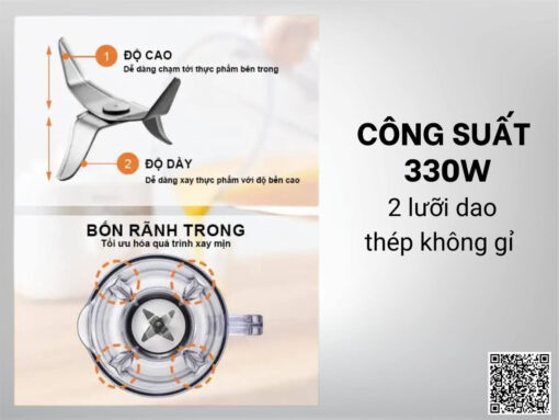 Công suất 330W, 2 lưỡi dao thép không gỉ xay khoẻ và nhuyễn mịn