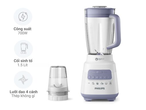 Máy xay sinh tố Philips HR2221/00 trang bị 2 cối xay, có thể xay sinh tố, xay đá bằng cối xay lớn 1.5 lít và xay hạt, nguyên liệu khô, xay gia vị bằng cối xay nhỏ 0.5 lít. 2 cối xay chất liệu nhựa kháng vỡ, an toàn và độ bền cao. Công suất 700W kết hợp với lưỡi dao 4 cánh thép không gỉ sắc bén giúp xay nhanh và khoẻ các nguyên liệu. Nút nhấn điều khiển với 5 tốc độ xay và 1 chế độ xay nhồi, dễ dàng sử dụng, phù hợp với mọi người dùng. Đặc biệt còn có chế độ vệ sinh nhanh cối xay, đem đến sự tiện dụng tối đa cho người dùng.
