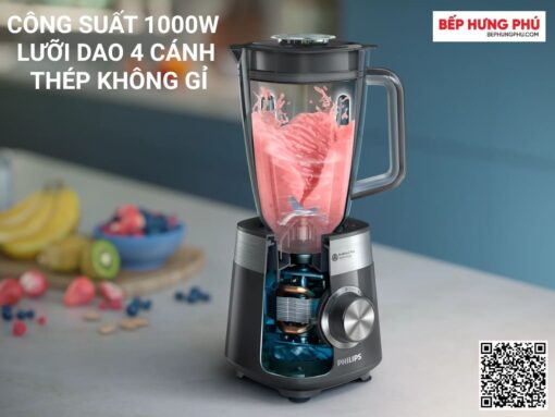Máy xay sinh tố Philips HR3020/20 được trang bị công suất 1000W mạnh mẽ, giúp xay nhanh, tiết kiệm được nhiều thời gian. Đặc biệt, động cơ khoẻ cùng thiết kế lưỡi dao 4 cánh bằng thép không gỉ sắc bén, đem đến khả năng xay nhuyễn mịn nhiều loại nguyên liệu từ rau củ quả mềm đến đá viên cứng. Lưỡi dao chống gỉ sét, an toàn khi tiếp xúc với thực phẩm và độ bền cao, dễ vệ sinh, làm sạch.
