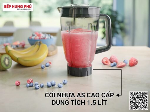 Máy xay sinh tố Philips HR3020/20 trang bị cối xay có dung tích lớn 1.5 lít, phù hợp cho gia đình 2-5 người, chất liệu cối nhựa AS cao cấp, bền chắc, đảm bảo an toàn thực phẩm và dễ vệ sinh, làm sạch.
