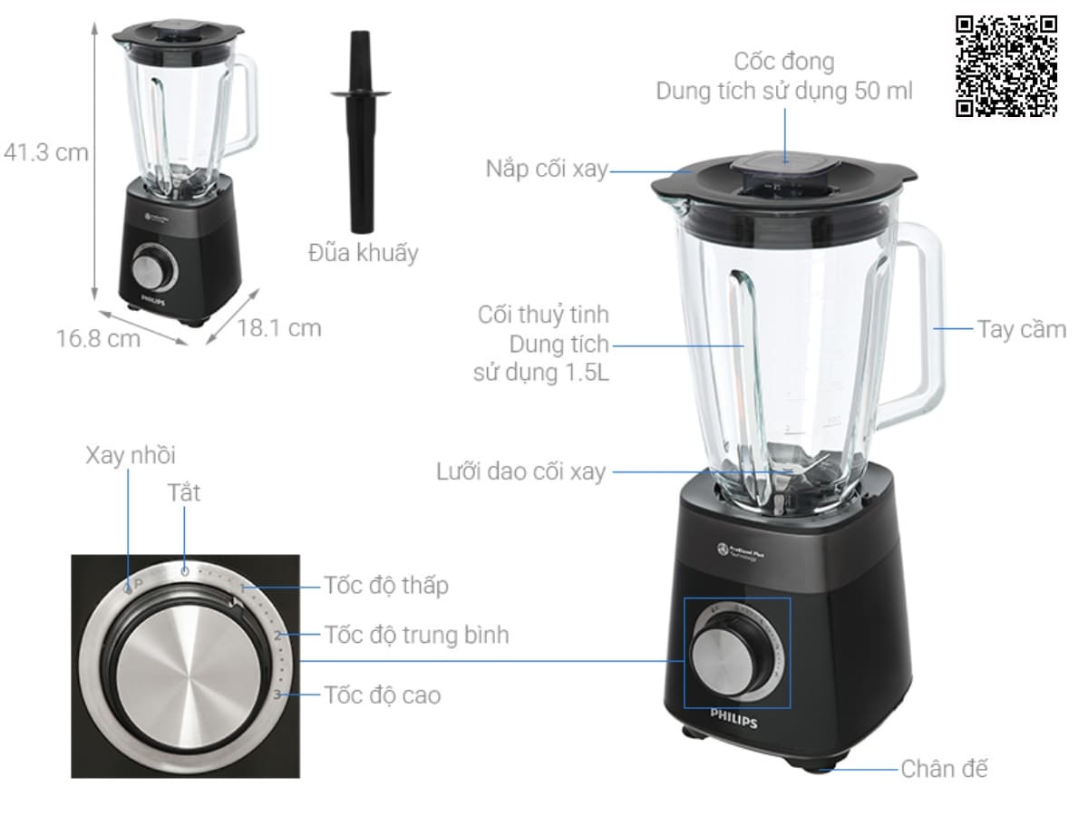 Máy xay sinh tố Philips HR3030/00 trang bị cối xay dung tích lớn 1.5 lít, chất liệu thủy tinh cao cấp, an toàn. Công suất 1200W mạnh mẽ kết hợp với lưỡi dao 4 cánh thép không gỉ sắc bén giúp xay nhanh và khoẻ các nguyên liệu. Bạn có thể thoải mái xay sinh tố, xay rau củ, xay đá… Có 3 tốc độ xay và 1 chế độ nhồi, điều khiển bằng núm vặn đơn giản, dễ dàng sử dụng.