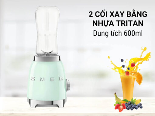 Máy xay sinh tố Smeg PBF01PGEU thiết kế mini nhỏ gọn, gồm 1 cối xay và 1 bình đựng nước ép có nắp đậy, thuận tiện mang theo đi học, đi làm, đi chơi… Dung tích mỗi bình 600ml phù hợp dùng cho cá nhân, chất liệu nhựa Tritan cao cấp, bền chắc, an toàn sức khoẻ. Công suất 300W cùng lưỡi dao 4 cánh thép không gỉ an toàn, giúp xay nhanh và khoẻ, mang đến cho bạn những ly sinh tố thơm ngon, đầy vitamin bổ dưỡng.