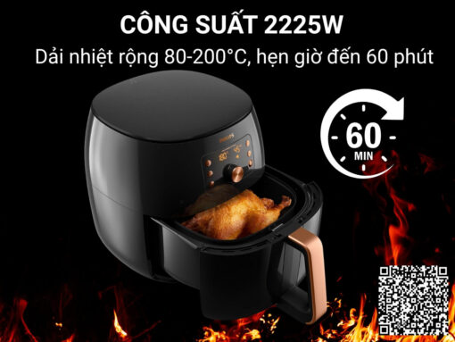 Công suất 2225W, dải nhiệt rộng 80-200°C, hẹn giờ đến 60 phút