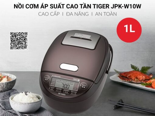 Nồi cơm áp suất cao tần Tiger JPK-W10W dung tích 1.0 lít cùng 20 chế độ nấu đa dạng, là lựa chọn lý tưởng cho gia đình 1-3 người. Nồi được trang bị 2 công nghệ nấu tiên tiến là nấu áp suất và nấu cao tần IH, đảm bảo nấu cơm thơm ngon và nấu nhiều món ăn khác một cách nhanh chóng, tiện lợi và bảo toàn đầy đủ dinh dưỡng trong món ăn. Đặc biệt có thể giữ cơm ngon đến 24 tiếng mà không bị nguội hay ôi thiu. Lòng nồi hợp kim 5 lớp phủ chống dính bền chắc, dễ vệ sinh. Hệ thống điều khiển nút nhấn điện tử có màn hình LCD hiển thị, sử dụng dễ dàng, thuận tiện.