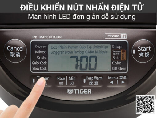 Nồi cơm áp suất cao tần Tiger JPK-W10W được trang bị hệ thống điều khiển nút nhấn điện tử và màn hình hiển thị LCD. Các chức năng được thể hiện rõ ràng, dễ đọc, dễ thao tác. Cùng với màn hình LCD hiển thị rõ ràng, sắc nét… giúp bạn dễ dàng theo dõi thông tin hoạt động của nồi.