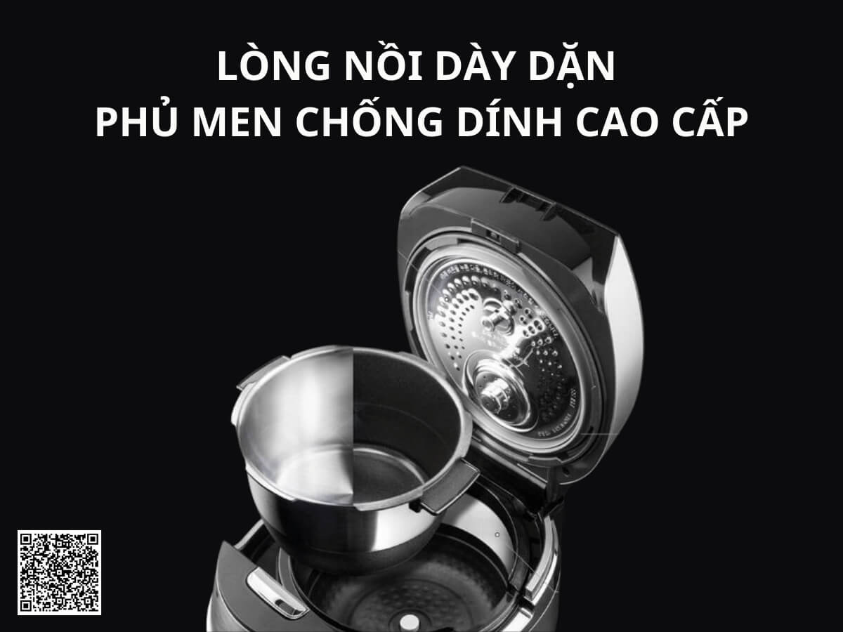 Cấu trúc đa lớp dẫn nhiệt ổn định cho phép nồi giữ nhiệt lâu hơn, giúp cơm luôn nóng hổi, thơm ngon ngay cả khi để lâu. Lòng nồi còn được nghiên cứu để hấp thụ và phân bổ nhiệt lượng đồng đều, phù hợp với nhiều chế độ nấu khác nhau như nấu cơm nhanh, cơm cháy, cháo, hầm xương hay hấp thức ăn.