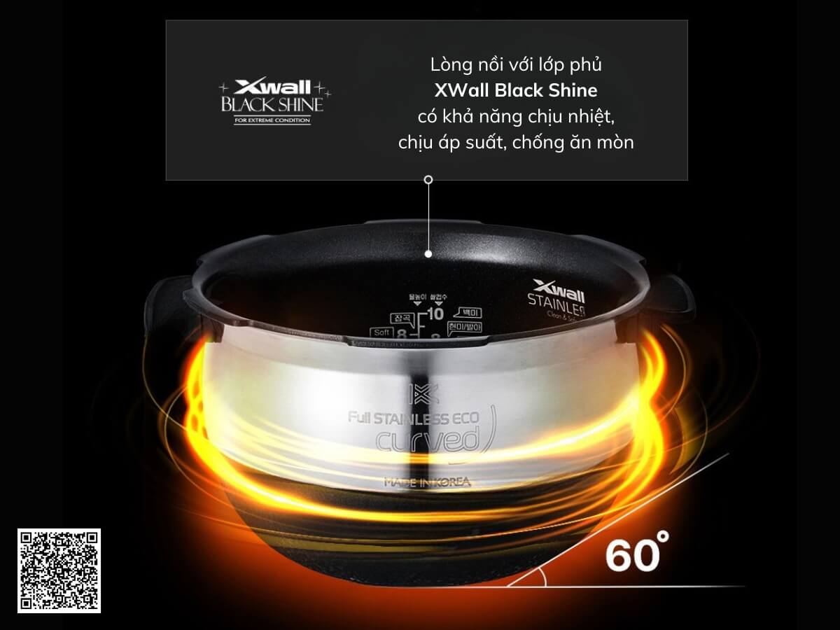 Đặc biệt, bên ngoài lòng nồi được phủ lớp men X-wall Black Shine cao cấp, độc quyền từ Cuckoo Hàn Quốc. Lớp phủ men này có khả năng chống dính tuyệt đối, có thể sử dụng với bất kỳ nguyên liệu nào mà không lo bám dính. Nhờ đó việc vệ sinh, làm sạch nồi sau khi nấu nướng cũng dễ dàng và nhanh chóng hơn rất nhiều. Lớp men X-wall cao cấp còn giúp giữ hương vị cơm thơm ngon nhất. Đồng thời chịu được nhiệt độ và áp suất cao trong quá trình nấu nướng mà không bị bong tróc.