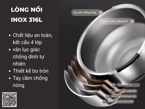• Lòng nồi INOX 316L cao cấp, vân lục giác chống dính tự nhiên
