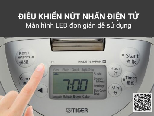 Nồi cơm điện cao tần Tiger JPF-A55W-W được trang bị hệ thống điều khiển nút nhấn điện tử có màn hình LCD hiển thị, giúp tăng tính hiện đại và tiện lợi cho sản phẩm.