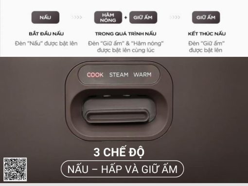 Nồi cơm điện Cuckoo CR-1755/KBBKCRVN cung cấp 3 chế độ: Nấu “Cook” – Hấp “Steam” và Giữ ấm “Warm”. Khi cơm được nấu chín, nồi sẽ tự động chuyển sang chế độ giữ ấm, đảm bảo cơm luôn nóng, ngon để sẵn sàng thưởng thức. Đặc biệt là nồi có khả năng giữ ấm lâu đến 12 tiếng, giữ cơm luôn ấm nóng, mềm ngon, không bị khô hay thiu. Ngoài ra, bạn cũng có thể sử dụng nồi để hấp bánh, hải sản, rau củ… tiện dụng.