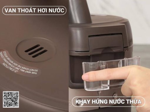 Nồi cơm điện Cuckoo CR-1755/KBBKCRVN còn tích hợp van thoát hơi trên nắp nồi, có tác dụng đảm bảo ổn định hơi nước trong nồi, cho cơm chín ngon hơn. Bên cạnh đó là khay hứng nước thừa giúp nước thừa không rơi ra ngoài làm bẩn nồi và mặt bàn. Khay hứng nước này được thiết kế dễ dàng tháo lắp để tiện lợi vệ sinh, làm sạch.