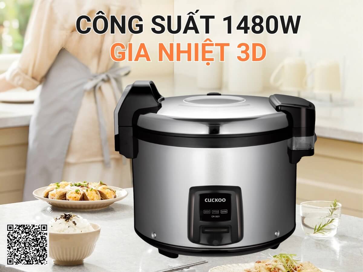 Nồi cơm điện cuckoo CR-3021/BKSTVNCV hoạt động mạnh mẽ với công suất 1480W và công nghệ nhiệt 3D giữ nhiệt 3 chiều mang lại hiệu quả nấu cơm nhanh chóng với khối lượng gạo lớn, chín đều và giữ trọn được hương vị thơm ngon của nguyên liệu khi nấu, đảm bảo các chất dinh dưỡng được giữ lại tối ưu nhất.