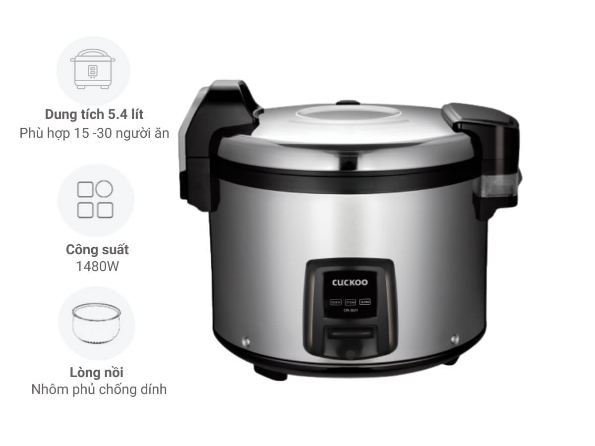Nồi cơm điện cuckoo CR-3021/BKSTVNCV với dung tích siêu lớn 5.4 lít, là lựa chọn lý tưởng cho các bếp ăn tập thể như công ty, trường học, nhà hàng (phục vụ 15 -30 người). Thiết kế hiện đại, chắc chắn với toàn thân bọc inox sáng bóng đảm bảo độ bền cao. Đặc biệt, công nghệ nấu nhanh bằng tia hồng ngoại và mâm nhiệt lớn giúp cơm chín đều, tơi xốp, thơm ngon. Nồi có 2 chế độ cơ bản: Nấu và Giữ ấm với rơ le tự ngắt tiện lợi.