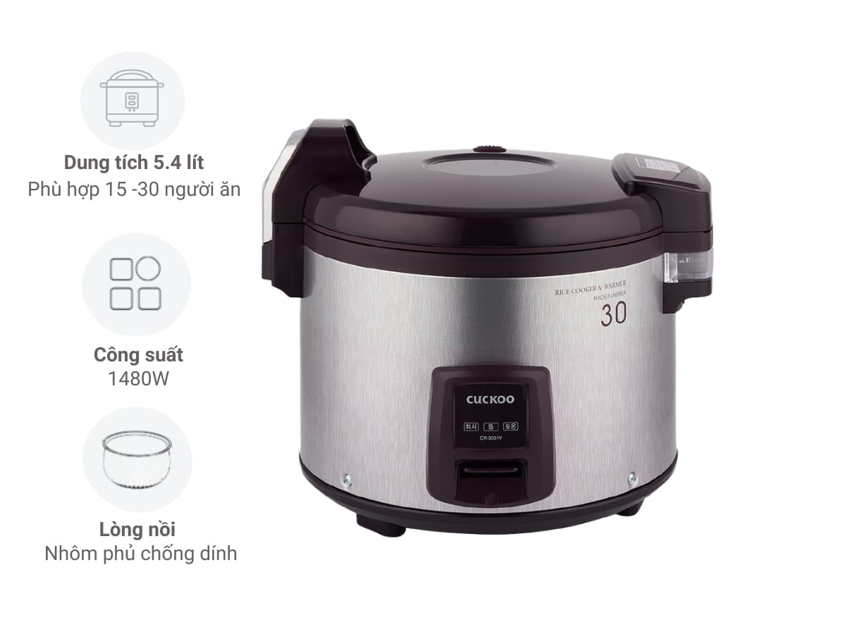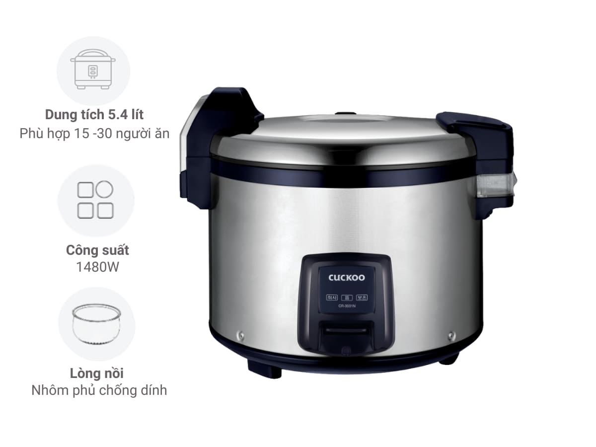Nồi cơm điện Cuckoo CR-3031N với dung tích siêu lớn 5.4 lít, là lựa chọn lý tưởng cho các bếp ăn tập thể như công ty, trường học, nhà hàng (phục vụ 15 -30 người). Thiết kế hiện đại, chắc chắn với toàn thân bọc inox sáng bóng đảm bảo độ bền cao. Nồi có 2 chế độ cơ bản: Nấu và Giữ ấm với rơ le tự ngắt tiện lợi.