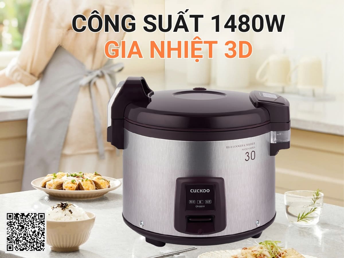 Nồi cơm điện Cuckoo CR-3031V hoạt động mạnh mẽ với công suất 1480W và áp dụng cơ chế tân tiến gia nhiệt 3D. Cơ chế này cung cấp nhiệt lượng lớn, toả đều trong lòng nồi, giúp nấu cơm nhanh chóng, tiết kiệm thời gian, tiết kiệm điện mà hạt cơm vẫn tơi xốp, giữ được chất dinh dưỡng và không bị cháy dính dù nấu số lượng nhiều.