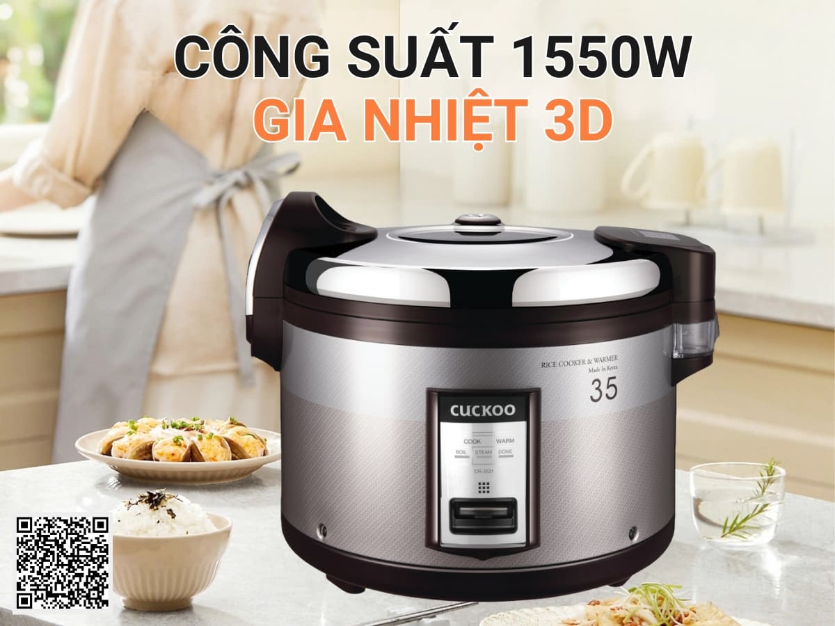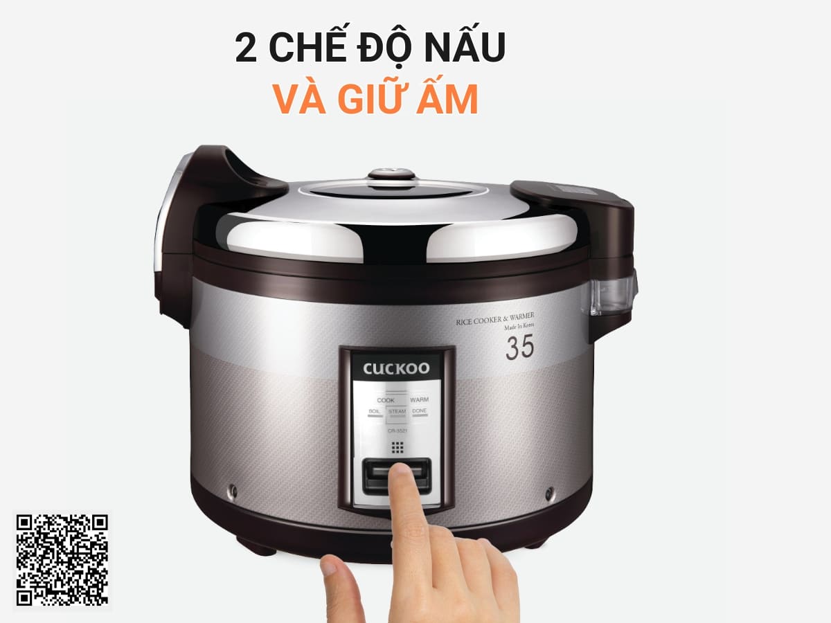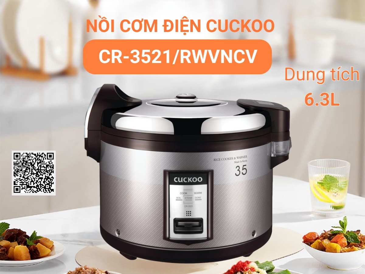 Nồi cơm điện cuckoo CR-3521/RWVNCV với dung tích siêu lớn 6.3 lít, là lựa chọn lý tưởng cho các bếp ăn tập thể như công ty, trường học, nhà hàng (phục vụ 15-35 người). Thiết kế hiện đại, chất liệu vỏ cao cấp và bền bỉ, đảm bảo an toàn cho người dùng trong suốt quá trình sử dụng. Đặc biệt, cơ chế tân tiến gia nhiệt 3D giúp nồi cơm điện nấu cơm chín nhanh, giữ được chất dinh dưỡng. Nồi có 2 chế độ cơ bản: Nấu và Giữ ấm với rơ le tự ngắt tiện lợi.