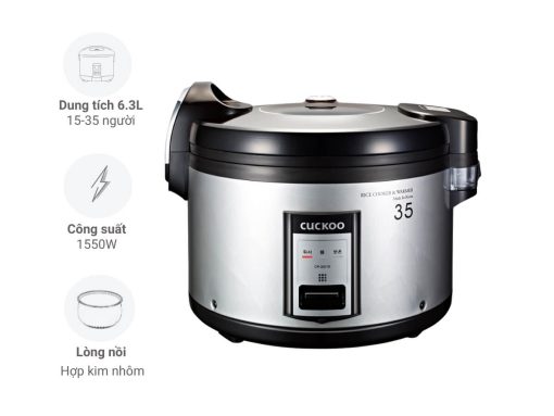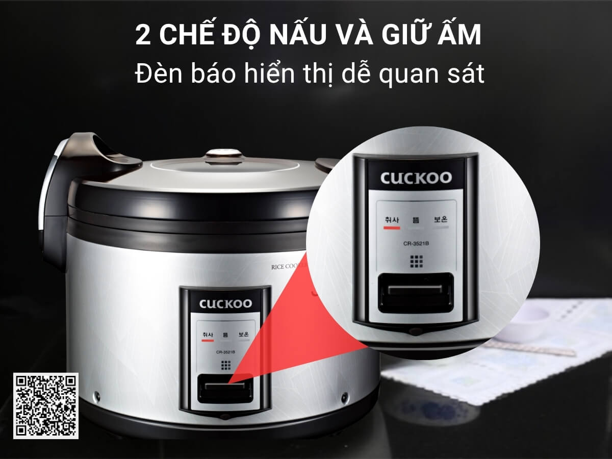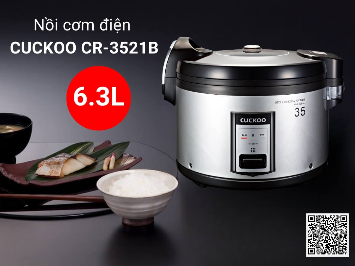 Với dung tích siêu lớn 6.3 lít, là lựa chọn lý tưởng cho các bếp ăn tập thể như công ty, trường học, nhà hàng (phục vụ 10-35 người). Thiết kế hiện đại, chất liệu vỏ cao cấp và bền bỉ, đảm bảo an toàn cho người dùng trong suốt quá trình sử dụng. Đặc biệt, cơ chế tân tiến gia nhiệt 3d giúp nồi cơm điện nấu cơm chín nhanh, giữ được chất dinh dưỡng. Nồi có 2 chế độ cơ bản: Nấu và Giữ ấm với rơ le tự ngắt tiện lợi. Nồi cơm điện cuckoo CR-3521R dung tích 6.3 lít, thiết kế cao cấp bền bỉ [caption id="attachment_119196" align="alignnone" width="1200"] 2 chế độ nấu và giữ ấm[/caption]Nồi cơm điện cuckoo CR-3521R cung cấp 2 chế độ: Nấu “Cook” và Giữ ấm “Warm”. Khi cơm được nấu chín, rơ le sẽ tự động ngắt chế độ nấu và chuyển sang chế độ giữ ấm khi nhận biết nhiệt độ bên trong nồi đã ổn định, đảm bảo cơm luôn nóng, ngon để sẵn sàng thưởng thức. 2 chế độ được điều chỉnh bằng nút gạt đơn giản, dễ sử dụng. Cùng với đèn báo hiển thị 2 chức năng giúp bạn dễ quan sát. Lòng nồi hợp kim nhôm cao cấp [caption id="attachment_119198" align="alignnone" width="1200"] Showroom Bếp Hưng Phú[/caption]Ngoài ra quý khách hàng có thể tham khảo thêm các sản phẩm