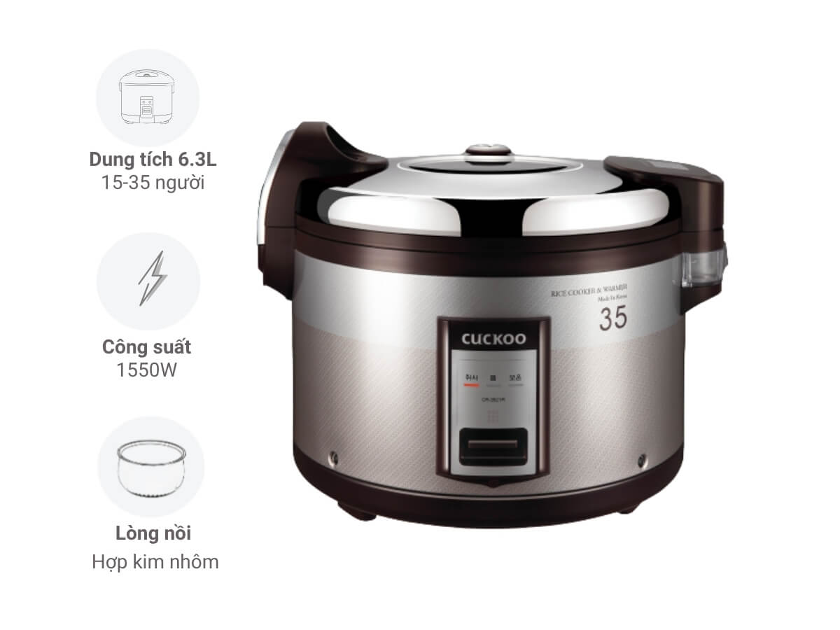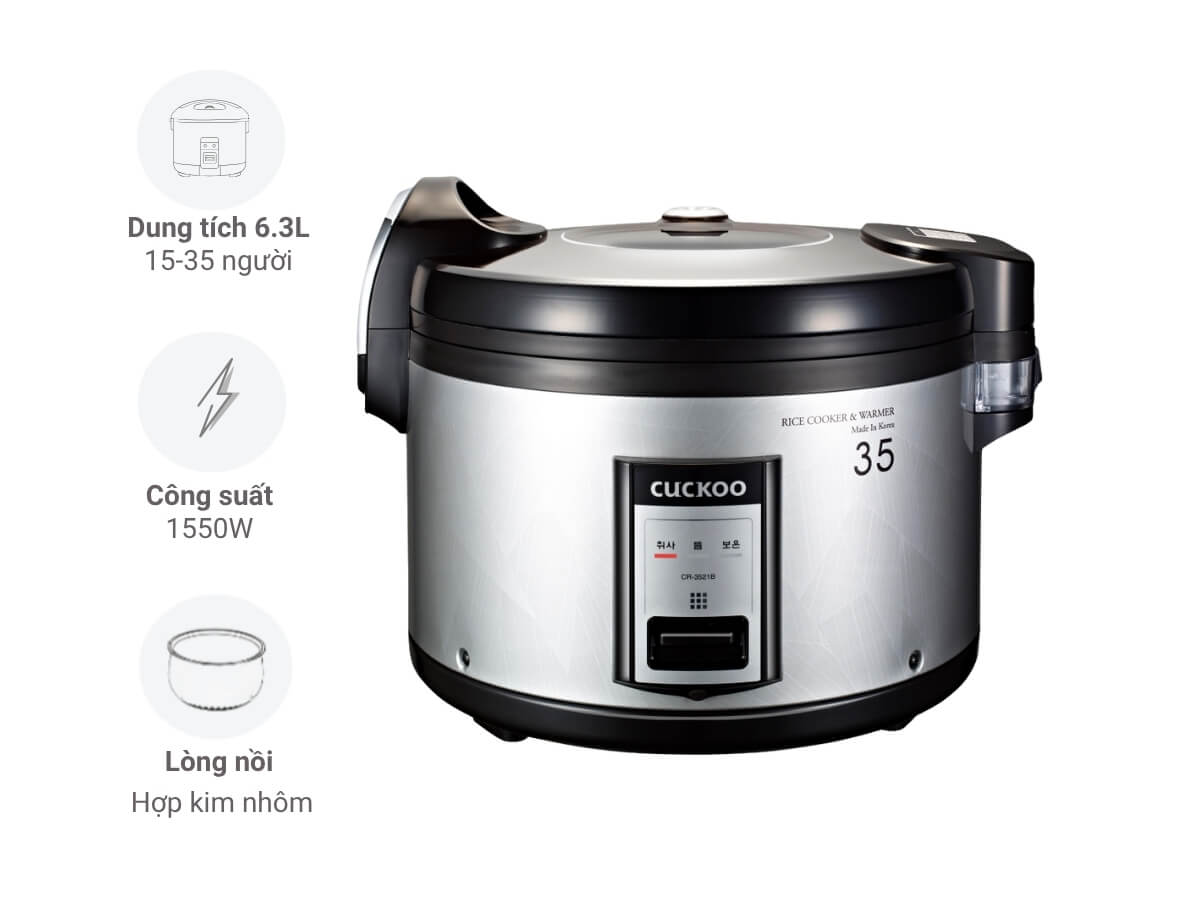 Nồi cơm điện cuckoo CR-3521R với dung tích siêu lớn 6.3 lít, là lựa chọn lý tưởng cho các bếp ăn tập thể như công ty, trường học, nhà hàng (phục vụ 10-35 người). Thiết kế hiện đại, chất liệu vỏ cao cấp và bền bỉ, đảm bảo an toàn cho người dùng trong suốt quá trình sử dụng. Đặc biệt, cơ chế tân tiến gia nhiệt 3d giúp nồi cơm điện nấu cơm chín nhanh, giữ được chất dinh dưỡng. Nồi có 2 chế độ cơ bản: Nấu và Giữ ấm với rơ le tự ngắt tiện lợi.
