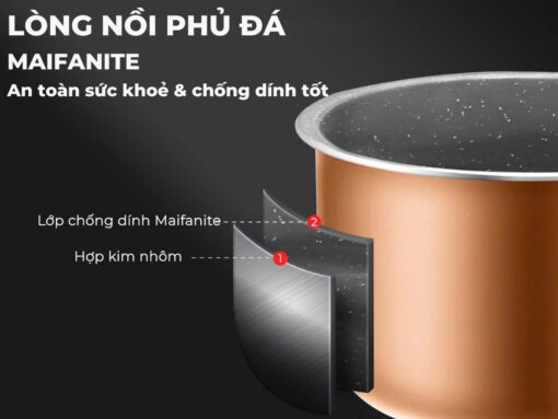 - Chất liệu an toàn, chống dính tự nhiên: Lòng nồi được phủ lớp đá Maifanite, một loại khoáng chất tự nhiên, tạo nên bề mặt chống dính vượt trội mà không cần đến lớp phủ hóa học. Điều này đảm bảo an toàn tuyệt đối, không thôi nhiễm chất độc hại vào thức ăn dù ở nhiệt độ cao.