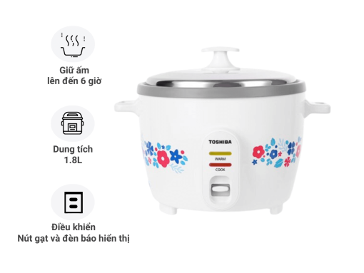 Nồi cơm điện Toshiba RC-18MH1PV(F) có 2 chức năng nấu và giữ ấm, có thể dùng nấu cơm, cháo, súp, lên men bột làm bánh… Sử dụng đơn giản chỉ nhấn nút.