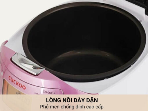 Nồi cơm điện tử Cuckoo CR-0631F có phần lòng nồi được làm từ hợp kim nhôm cao cấp, kết cấu dày dặn, đảm bảo độ chắc chắn và bền bỉ.