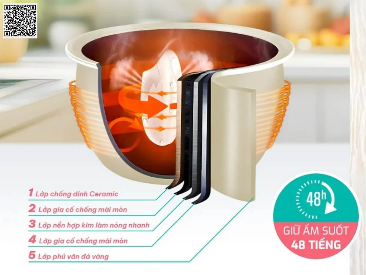 • Chống dính tự nhiên & Giữ nhiệt vượt trội: Lớp phủ Ceramic sứ mang lại khả năng chống dính hiệu quả. Chất liệu gang giúp giữ cơm ấm nóng suốt 48 giờ mà không bị ôi, cho bữa cơm luôn trọn vị.