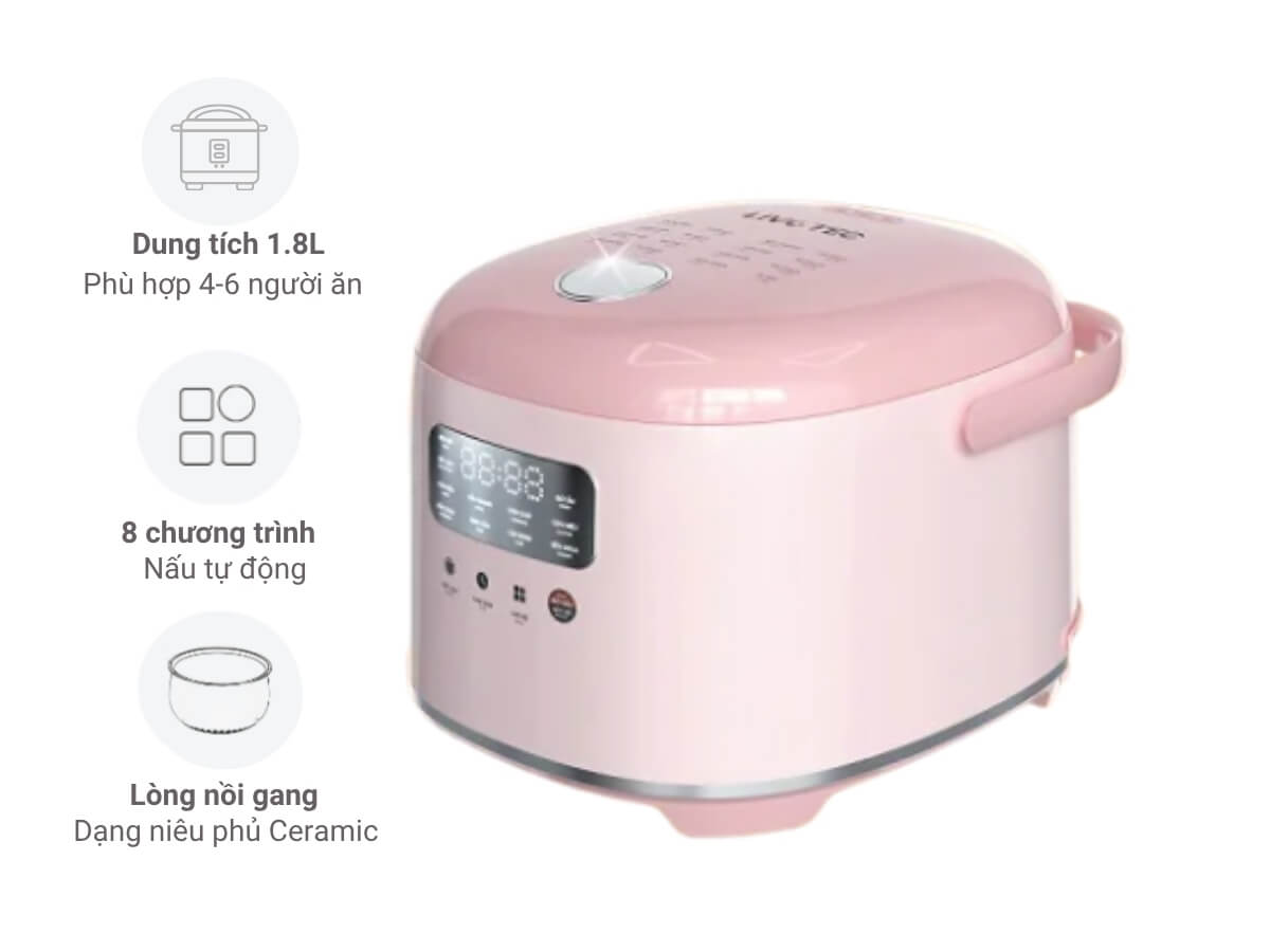 Nồi cơm điện tử Livotec LRC-E8118M có dung tích 1.8 lít, là lựa chọn hoàn hảo cho gia đình từ 4-6 thành viên. Sản phẩm là giải pháp nấu cơm tiện lợi, giúp bạn thưởng thức cơm ngon dẻo thơm như vừa nấu xong dù đã để qua ngày. Nồi được trang bị 8 chương trình nấu tự động đa dạng, kết hợp công nghệ điều chỉnh nhiệt thông minh UDO°Smart với mâm nhiệt cong 3D. Đặc biệt, lòng nồi gang dạng niêu phủ Ceramic cao cấp giúp mang đến những bữa cơm chín đều, giữ trọn dinh dưỡng và tuyệt đối an toàn cho sức khỏe.