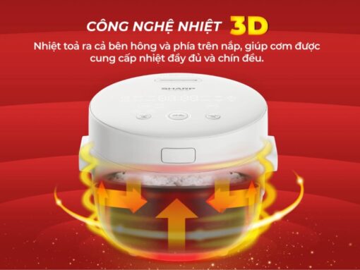 Nồi cơm điện tử Sharp KS-COM110DV-WH trang bị công suất 790W mạnh mẽ, đảm bảo khả năng nấu nướng nhanh chóng, tiết kiệm nhiều thời gian. Đặc biệt là công nghệ gia nhiệt 3D – cung cấp nhiệt lượng từ 3 hướng: từ dưới lên, từ trên xuống và xung quanh thành nồi, giúp nấu cơm chín đều tại mọi vị trí.