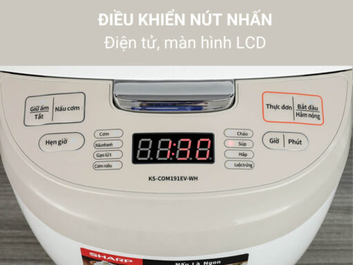 Nồi cơm điện tử Sharp KS-COM191EV-WH được trang bị hệ thống điều khiển nút nhấn điện tử và màn hình LCD. Các chức năng được thể hiện rõ ràng, dễ đọc, dễ thao tác, giao diện tiếng Việt phù hợp với mọi người dùng. Cùng với màn hình LCD hiển thị rõ ràng, sắc nét… giúp bạn dễ dàng theo dõi thông tin hoạt động của nồi.