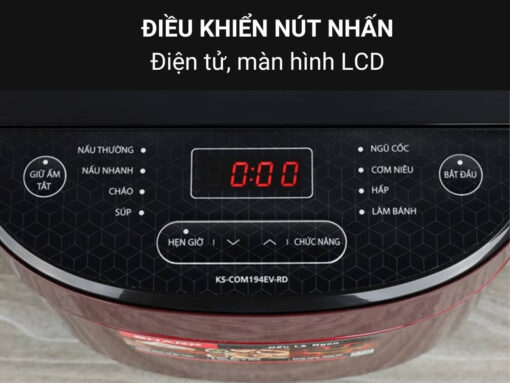 Nồi cơm điện tử Sharp KS-COM194EV-RD được trang bị hệ thống điều khiển nút nhấn điện tử và màn hình LCD. Các chức năng được thể hiện rõ ràng, dễ đọc, dễ thao tác, giao diện tiếng Việt phù hợp với mọi người dùng. Cùng với màn hình LCD hiển thị rõ ràng, sắc nét… giúp bạn dễ dàng theo dõi thông tin hoạt động của nồi.