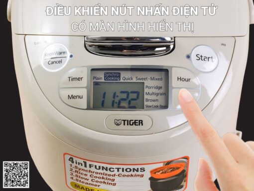 Nồi cơm điện tử Tiger JAX-R10W được trang bị hệ thống điều khiển nút nhấn điện tử và màn hình hiển thị LCD. Các chức năng được thể hiện rõ ràng, dễ đọc, dễ thao tác. Cùng với màn hình LCD hiển thị rõ ràng, sắc nét… giúp bạn dễ dàng theo dõi quá trình hoạt động của nồi.