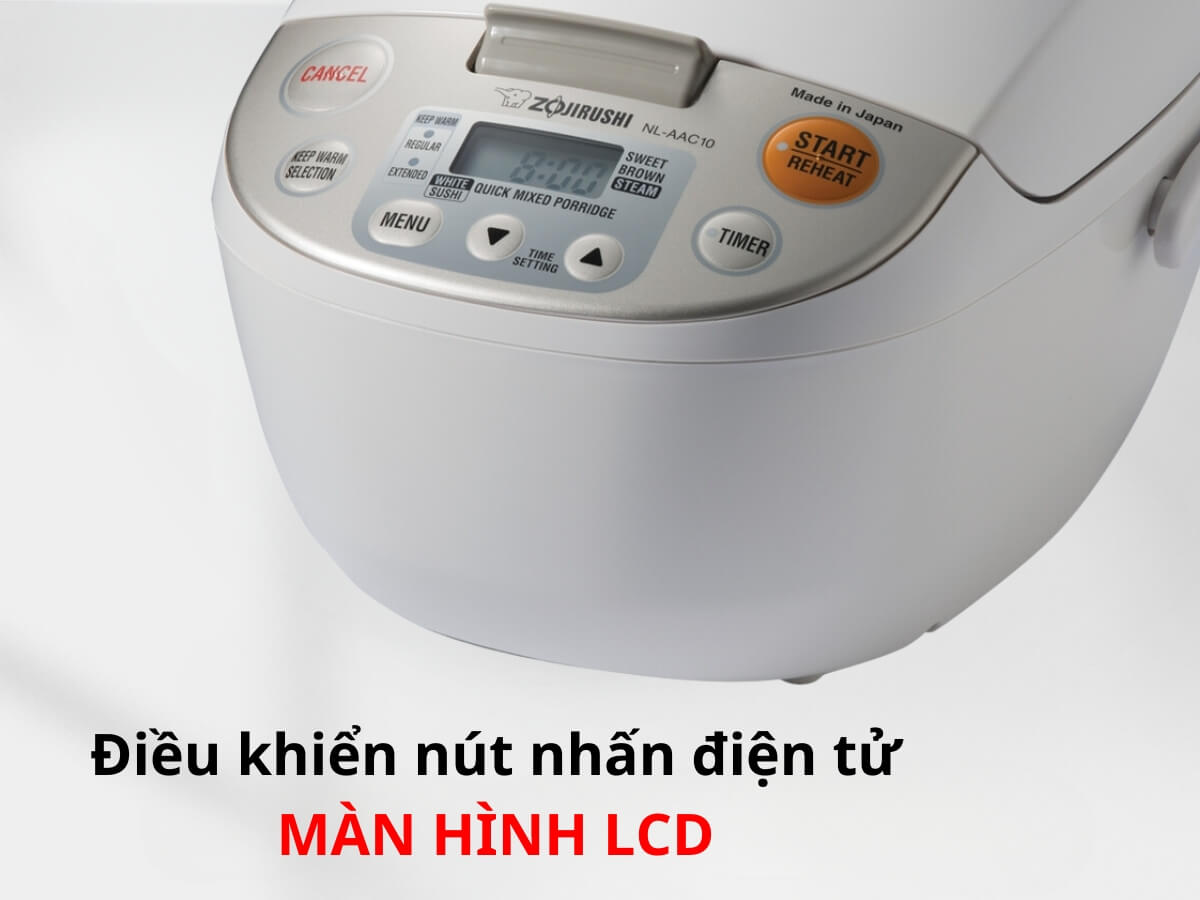 Nồi cơm điện tử Zojirushi NL-AAQ10-CA được trang bị hệ thống điều khiển nút nhấn điện tử và màn hình hiển thị LCD. Các chức năng được thể hiện rõ ràng, dễ đọc, dễ thao tác. Cùng với màn hình LCD hiển thị rõ ràng, sắc nét… giúp bạn dễ dàng theo dõi thông tin hoạt động của nồi.
