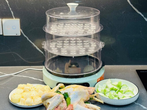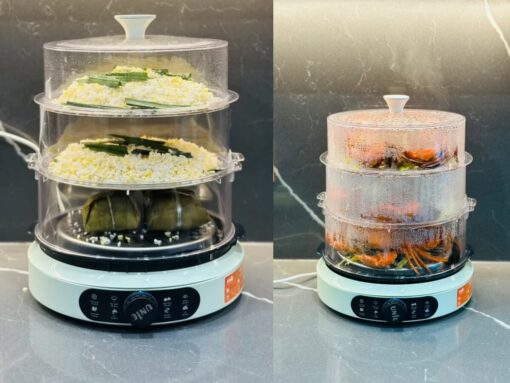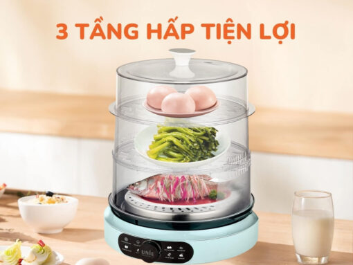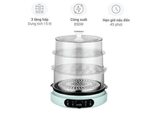 Nồi hấp điện Unie UE-680 thiết kế 3 tầng với tổng dung tích 15 lít dễ dàng hấp gà nguyên con, thoải mái hấp bánh, rau củ, hải sản… có thể phục vụ tốt cho gia đình 4-6 người. Lồng hấp trong suốt dễ quan sát quá trình hấp bên trong, các bộ phận tháo rời dễ dàng vệ sinh. Điều khiển dễ dàng bằng núm vặn, hẹn giờ nấu tối đa đến 45 phút. Đặc biệt còn có chế độ khử trùng giúp vệ sinh, khử khuẩn đồ dùng em bé như bình sữa, bộ đồ ăn… đảm bảo sạch sẽ, an toàn.