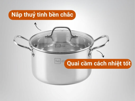 Nồi inox 3 lớp liền thân Fivestar 20cm với phần nắp nồi được làm từ thủy tinh với kết cấu dày dặn, chắc chắn, chịu được nhiệt độ cao và chịu được những va chạm trong quá trình nấu nướng, cho độ bền bỉ đáng tin cậy.